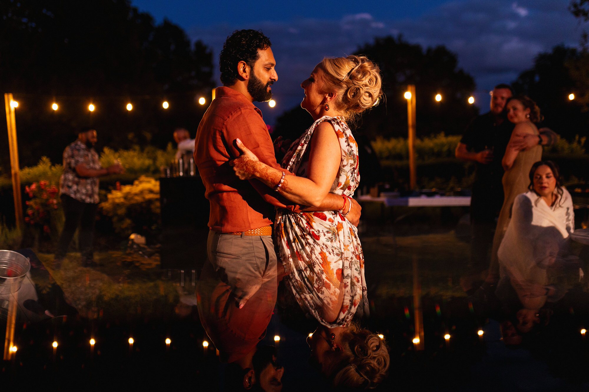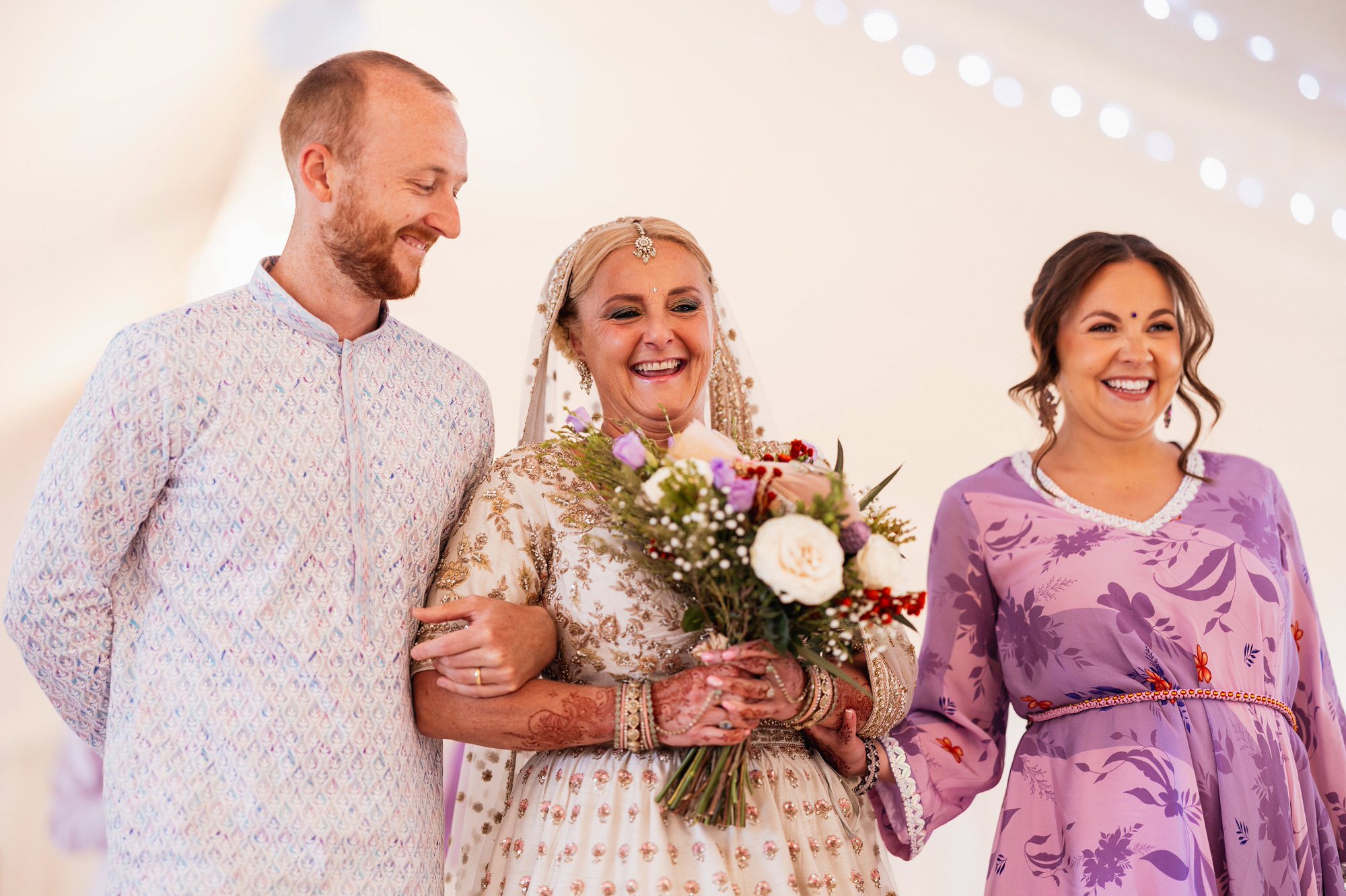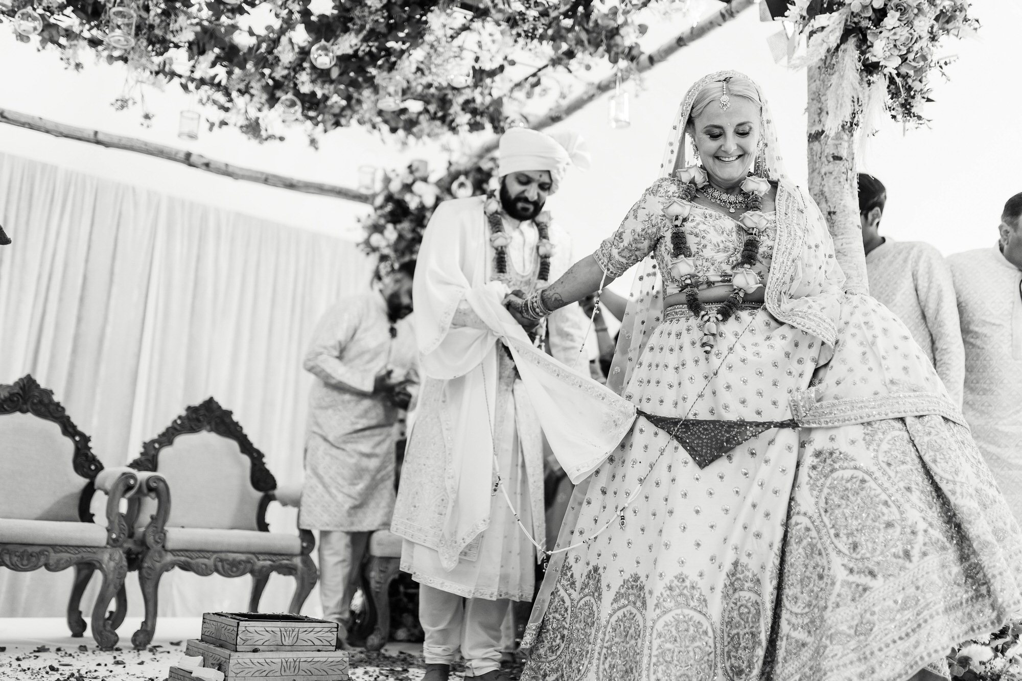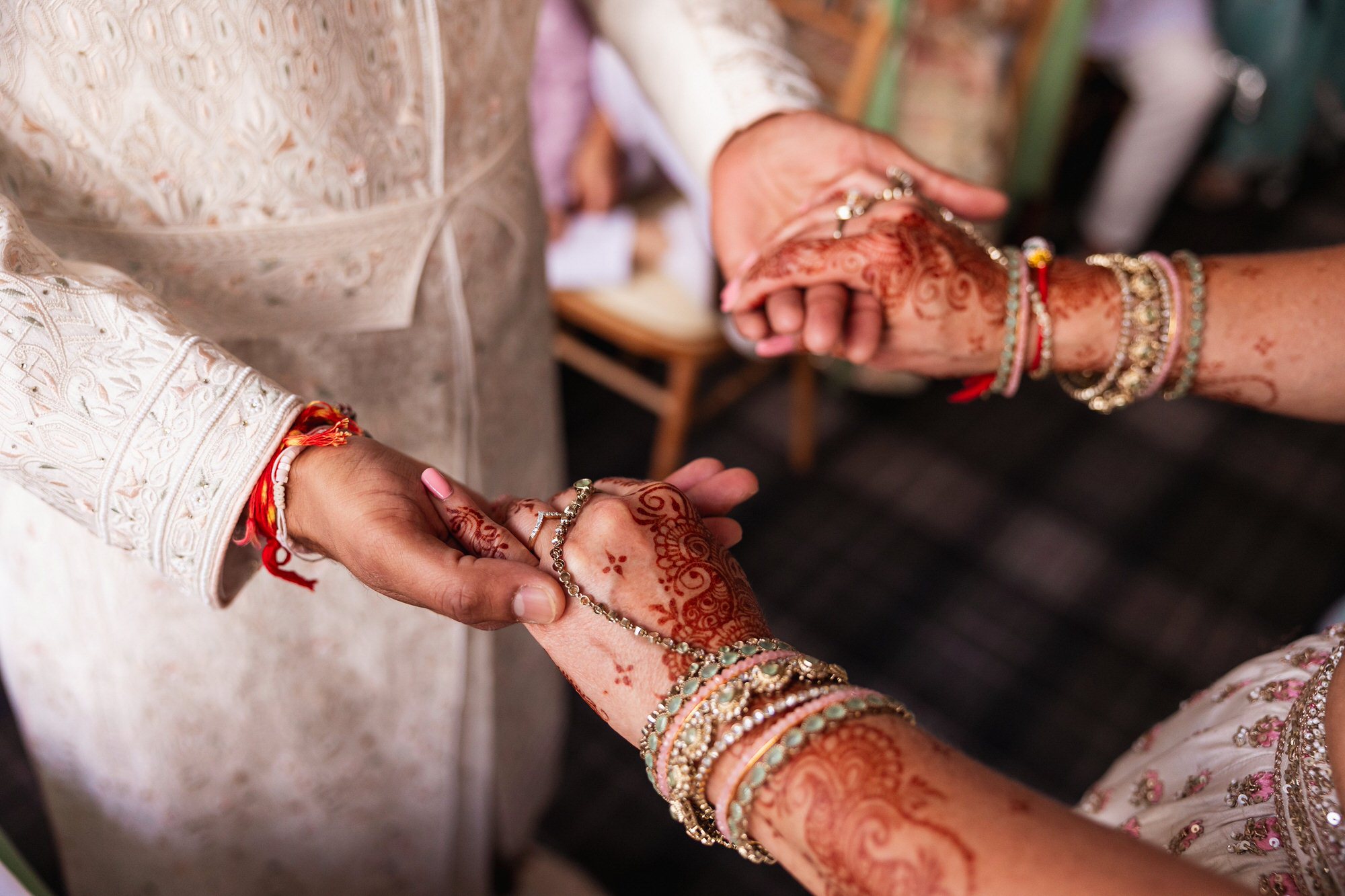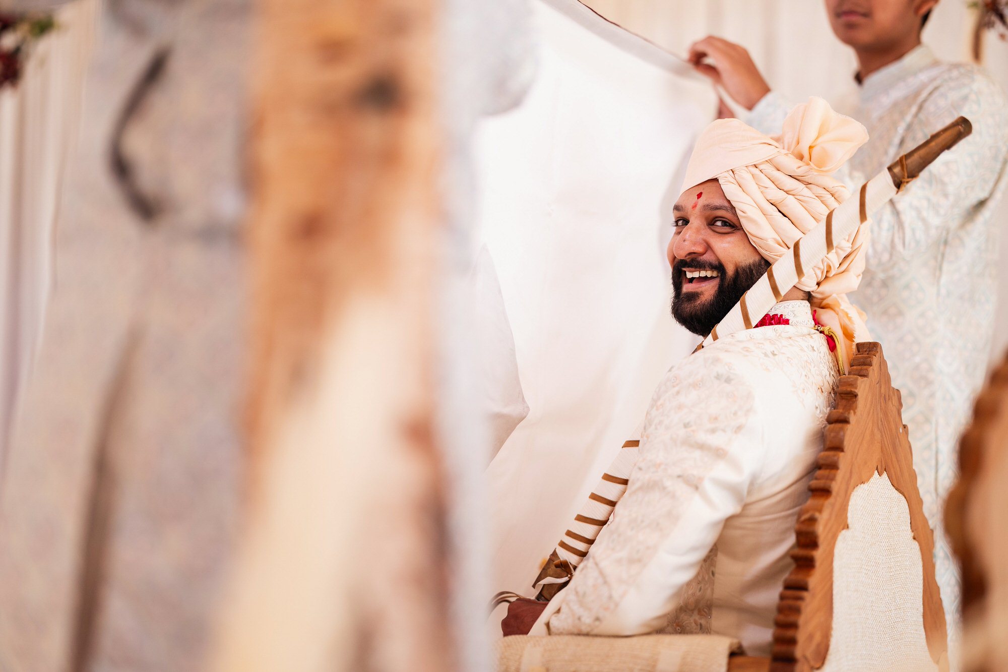 Outside, at the front of the house, Suri was ready and waiting with his family for the bharaat. Soon, the sound of music and joyful cheers filled the air as they danced their way towards Elisa’s family — a vibrant start to their Hindu ceremony.
